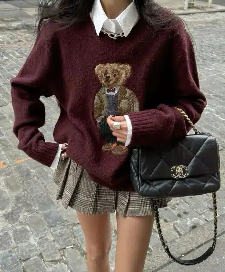 A maroon knitted sweater is an essential piece for your autumn wardrobe. Its rich hue complements the seasonal palette beautifully.