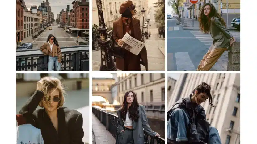 Fashionable individuals in urban settings, showcasing stylish autumn outfits, featuring coats, blazers, and casual streetwear.