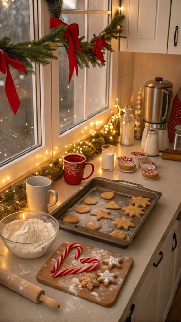 Cozy Christmas kitchen scene with holiday cookies, candy canes, baking supplies, and festive decor lights near a window.